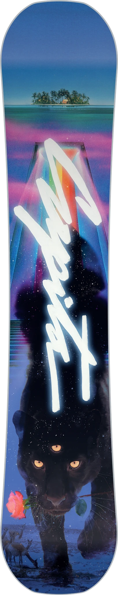The Space Metal Fantasy is a twin for ladies with freestyle ambitions. The board is light and steers easily. This is due to the wooden core, which is encased in two-layer fibreglass. The ideal mix between stiffness and freedom. It has plenty of room for error and will not let you down when learning new tricks. Despite its freestyle capabilities, it is also a board that can hold its own on the piste. The base is fast and quite hard. So it doesn’t mind a bit of speed either. It’s still a good all-round board for hitting the slopes, as long as you don’t have a high tempo. The print is one you like or not. Alpacas are sweet. At least not one of those fancy prints. We love it anyway!